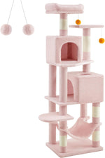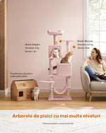 Ansamblu de Joaca pentru pisici, NextWave®, tip turn, 2 platforme de observatie, 3 niveluri, 2 casuta, 5 stalpi pentru zgariat, hamac, mingiute de joaca, inaltime 155 cm, roz