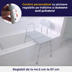 Scaunul este reglabil pe inaltime, astfel incat sa se adapteze la diferite tipuri de cazi si utilizatori. Dispune de brate de sprijin ergonomice si de un spatar confortabil, care sporesc stabilitatea si siguranta in timpul utilizarii. Designul sau cu 3 piese asigura o montare rapida si usoara, fara unelte, fiind ideal atat pentru acasa, cat si pentru centre de ingrijire.