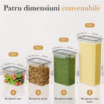 Fiecare recipient este prevazut cu capac etans de culoare neagra, care previne patrunderea umiditatii si mentine prospetimea si aroma alimentelor. Setul contine recipiente de 4 dimensiuni diferite (0.8L, 1.4L, 2L si 2.8L), perfecte pentru diverse tipuri de alimente.