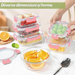 Set 12 Caserole Alimentare din sticla NextWave®️ Capace Etanse, Depozitare Frigider si Congelator, Potrivite pentru Microunde, Fara BPA, Organizare Bucatarie, Inchidere cu 4 Clipsuri, Usor de Curatat, Transparent, Roz