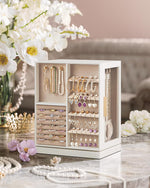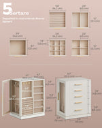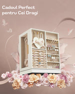 Cutia dispune de 5 sertare spatioase si 18 carlige dedicate pentru coliere, precum si compartimente speciale pentru inele, verighete, cercei, bratari si alte accesorii. Datorita sistemului rotativ la 360°, toate bijuteriile sunt usor accesibile, fara a fi nevoie sa cauti in sertare intunecate.