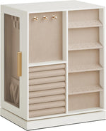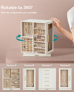 NextWave® Cutie de bijuterii verticala rotativa 360° cu 5 sertare, 18 carlige pentru coliere, compartimente pentru inele si cercei, interior catifelat, exterior din piele ecologica, geam frontal transparent, dimensiuni 16 × 22,2 × 28,5 cm, Alb