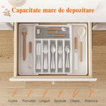 Designul sau extensibil permite ajustarea dimensiunilor de la 33 cm pana la 57 cm, adaptandu-se perfect la diferite tipuri de sertare. Cu pana la 9 compartimente, ai suficient spatiu pentru a organiza linguri, cutite, furculite, ustensile de gatit si alte accesorii de bucatarie, astfel incat sa le gasesti rapid si sa le folosesti cu usurinta.