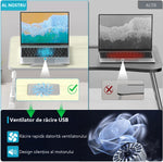 Cu o greutate de aproximativ 2 – 2.5 kg, masa este stabila, dar in acelasi timp suficient de usoara pentru a fi mutata cu usurinta. Designul ergonomic ajuta la reducerea disconfortului cauzat de utilizarea prelungita a laptopului si ofera o postura mai sanatoasa in timpul lucrului.