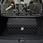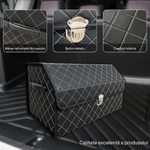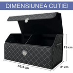 Cu dimensiuni generoase de 53x31x30 cm, acest organizator negru se pliaza cu usurinta atunci cand nu este utilizat, economisind spatiu si fiind simplu de depozitat. Designul sau elegant si culoarea negru cu ata alba se potrivesc armonios cu interiorul oricarui vehicul, adaugand un aspect de ordine si profesionalism.